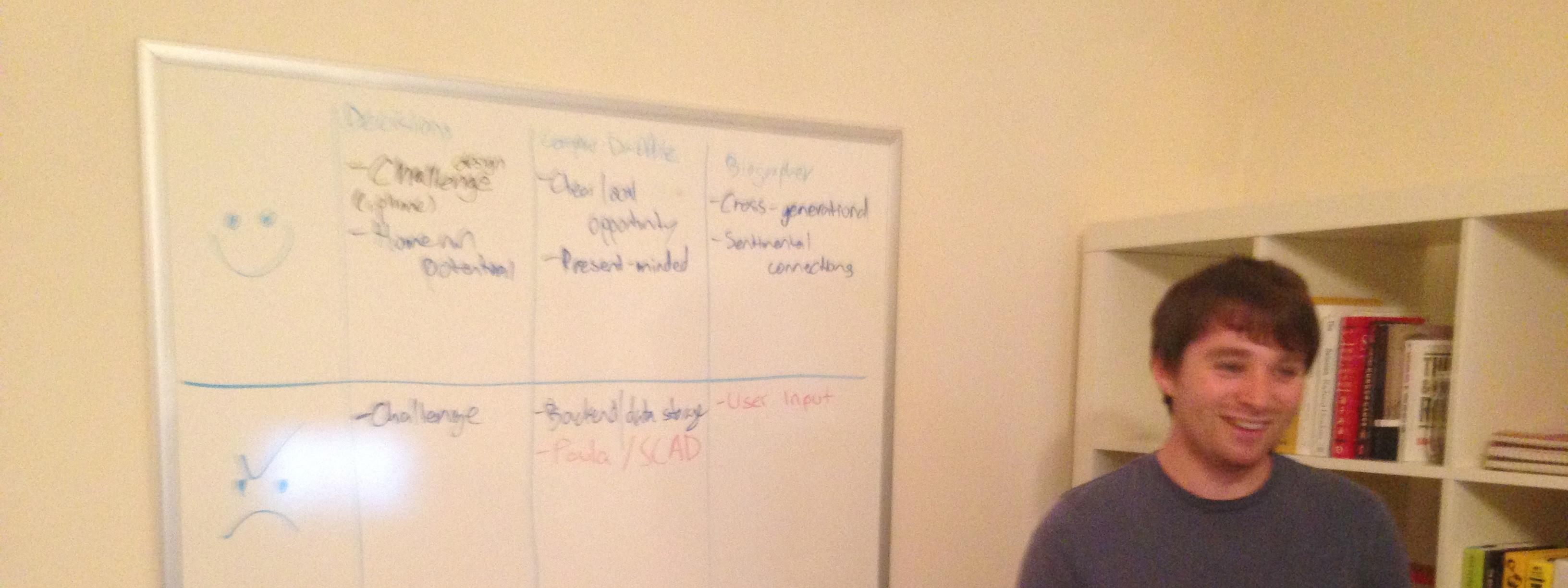 Me at the helm of Joseph's whiteboard, on which was basically our first prototype choosing itself.