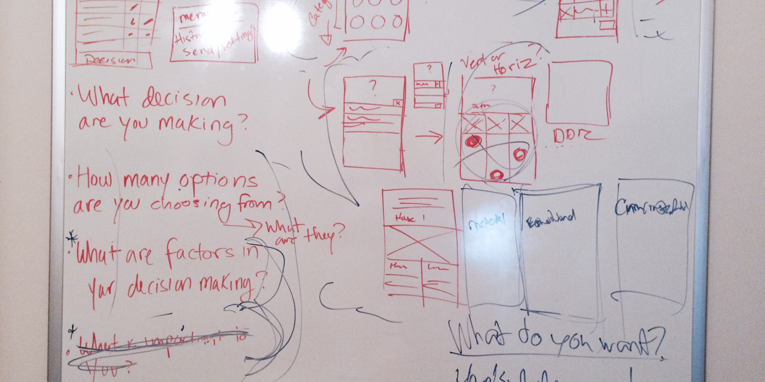 To move as quickly as possible, and because we figured that given decision-making is a universally relatable concept we could get away with it, we eschewed deep user research and leaned on ourselves and our own instincts. (Whether or not this is a popular way to work as a professional designer, it was a great learning experience for us.)