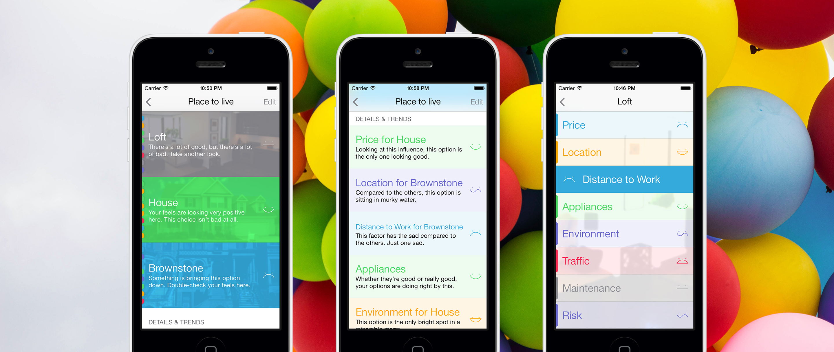 Boldened, originally Feels, was designed to help its users "make happier decisions." TechCrunch's Sarah Perez declared it "the pro/con list for the emoticon generation." Using emoticons for rating, rather than harder-to-understand numeric scores or percentages, Boldened made decisions with a lot of options or lots of data easier to understand.