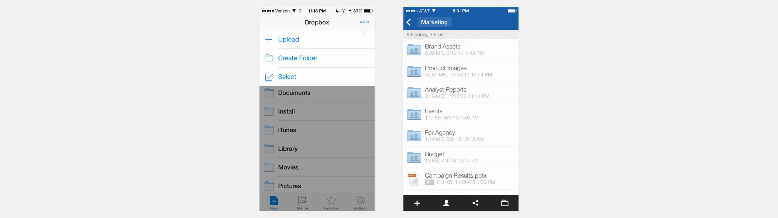 Screenshots from Dropbox (left) and Box, circa 2014.