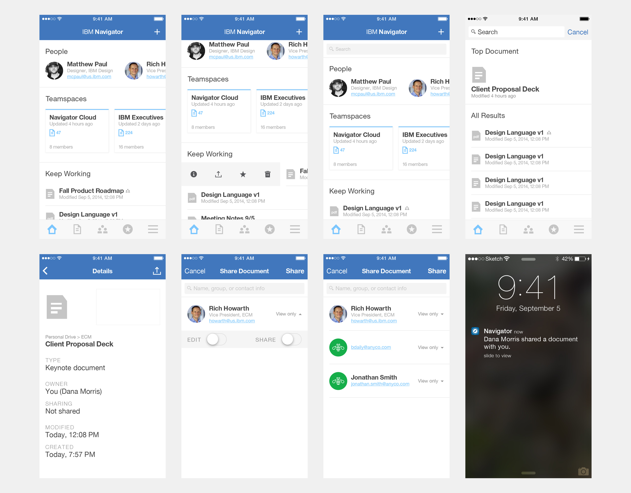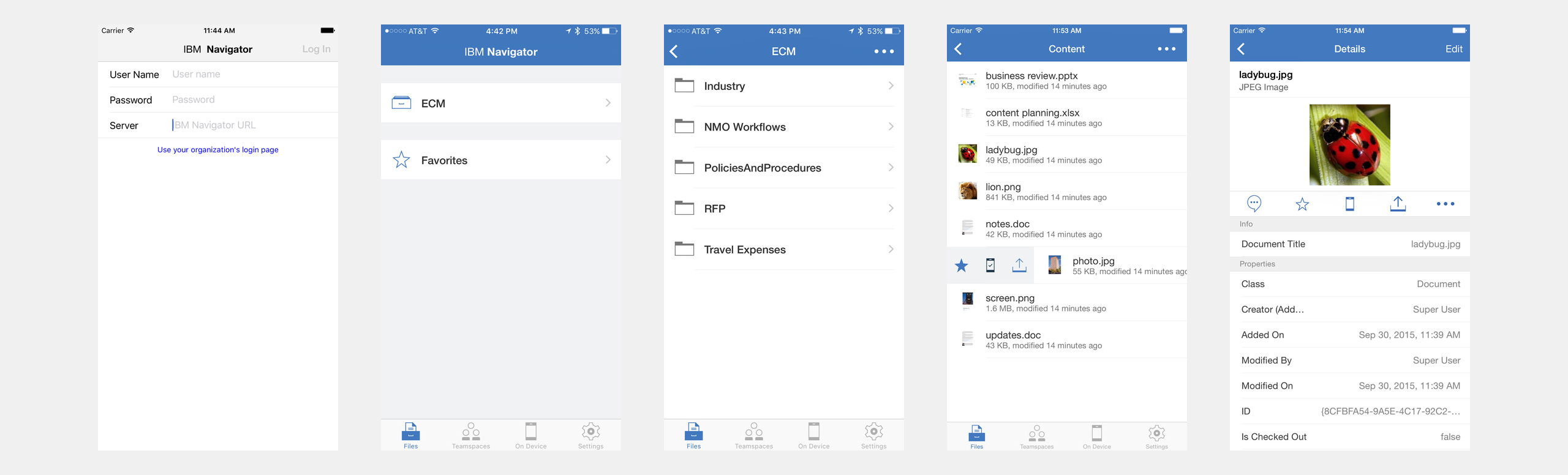 IBM Navigator Mobile is an enterprise sync-and-share app for iPhone, made to work with IBM Content Navigator repositories. Navigator Mobile was the first product released by the ECM division conceived through IBM Design Thinking.