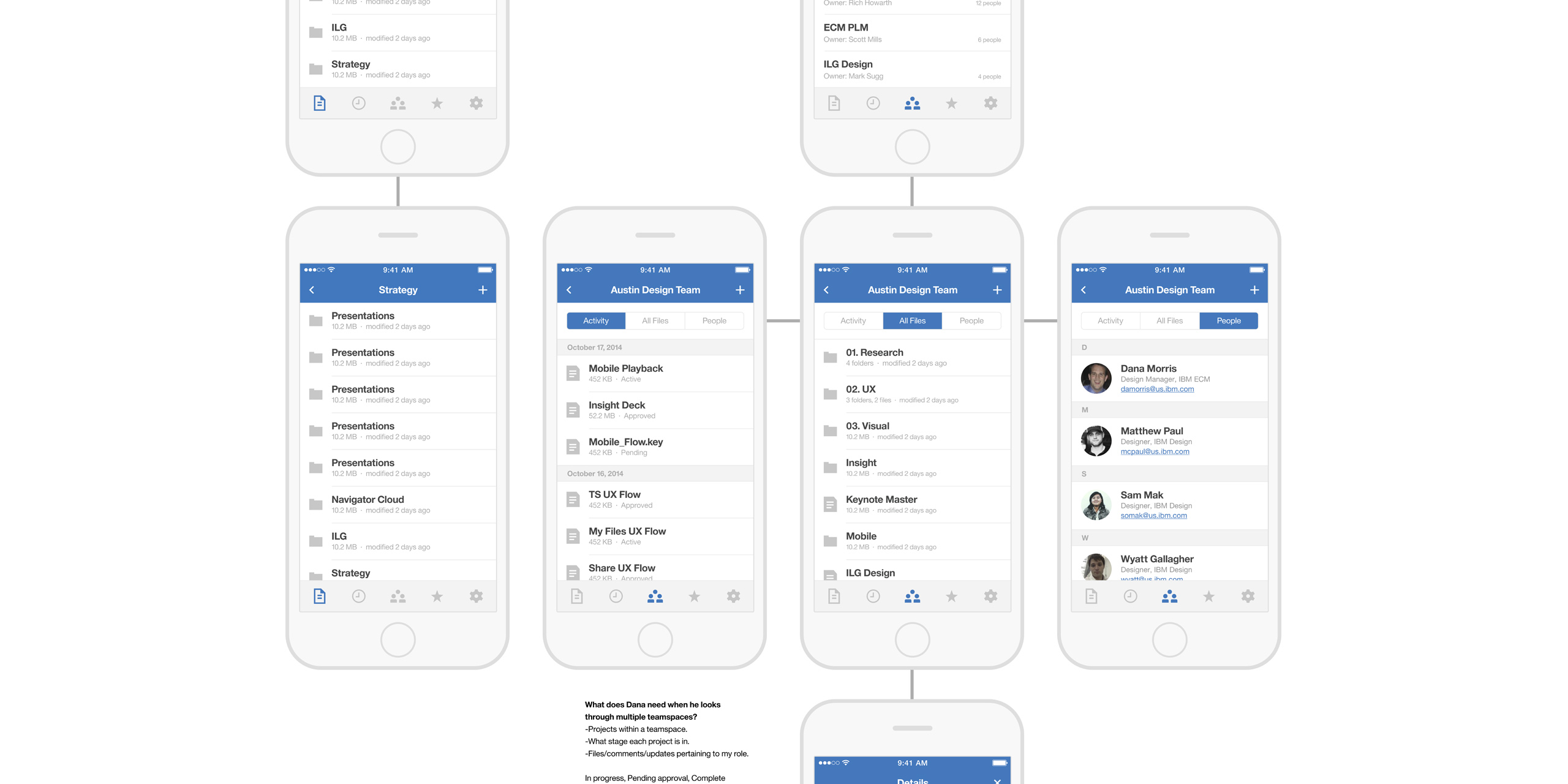 Our original design concepts circled around our prior research into "teamspaces" and heavy collaboration with predictive services. We knew these would have to be pared down in time, both to focus on the core sync-and-share functionality and to remain feasible given the current state of the platform and the capabilities of our development team.